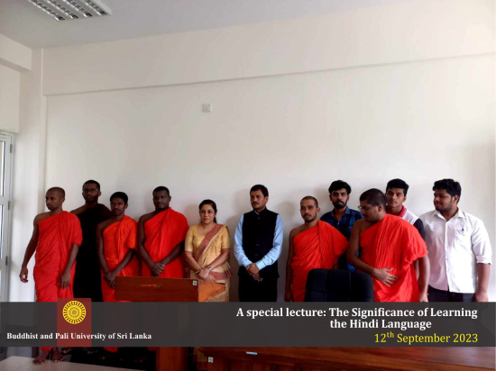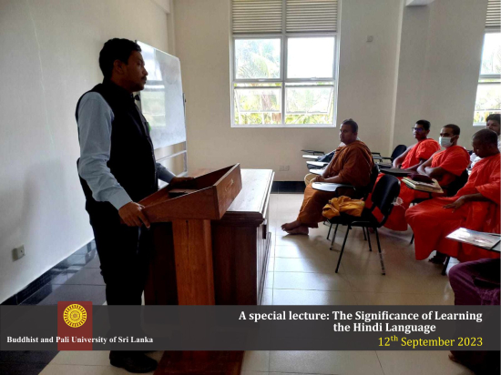 A special lecture on "The Significance of Learning Hindi" was held in celebration of National Hindi Day in India. The lecture was conducted by Professor Mukesh Kumar Mishra on September 12, 2023, at the Buddhist and Pali University of Sri Lanka. Professor Mukesh Kumar Mishra is a faculty member at Siddharth University in Gorakhpur, India.