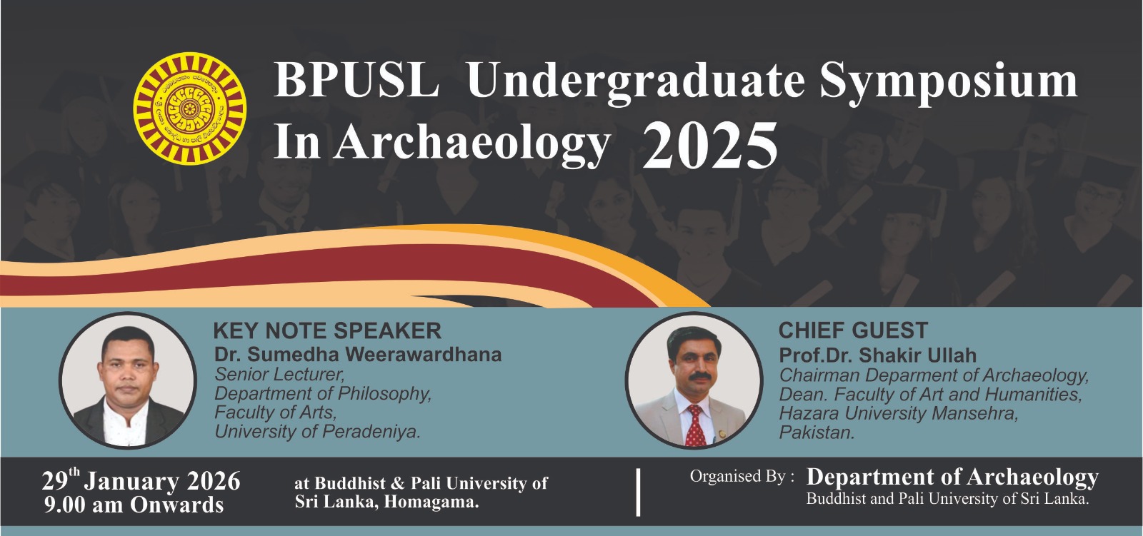 ශ්‍රී ලංකා බෞද්ධ හා පාලි විශ්වවිද්‍යාලයේ පුරාවිද්‍යා අධ්‍යයනාංශය මඟින් උපාධි අපේක්ෂකයන් සඳහා සංවිධානය කරනු ලබන පුරාවිද්‍යා පර්යේෂණ සමුළුව (BPUSL UNDERGRADUATE SYMPOSIUM IN ARCHAEOLOGY) 2026 ජනවාරි 30 දින විශ්වවිද්‍යාල පරිශ්‍රයේ දී පැවැත්වේ.